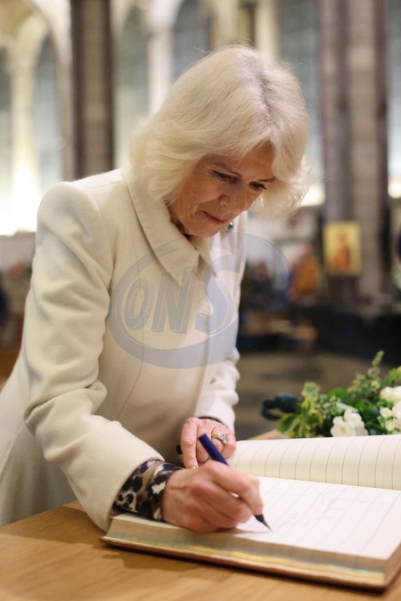 SALISBURY, ENGLAND - FEBRUARY 08: Queen Camilla signs the guestbook during a musical evening at Salisbury Cathedral on February 08, 2024 in Salisbury, England. The evening is being held to celebrate the work of local charities including The Wiltshire Bobby Van Trust, The Wiltshire Air Ambulance, Community First ‚Äě Youth Action Wiltshire and the regimental charities of The Grenadier Guards and The Rifles., Credit:Chris Jackson / Avalon