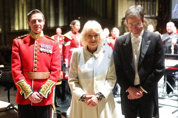 SALISBURY, ENGLAND - FEBRUARY 08: Captain Robert Smith Director of Music the Grenadier Guards Band, Queen Camilla and Rupert Egerton-Smith pose for a photograph during a musical evening at Salisbury Cathedral on February 08, 2024 in Salisbury, England. The evening is being held to celebrate the work of local charities including The Wiltshire Bobby Van Trust, The Wiltshire Air Ambulance, Community First ‚Äě Youth Action Wiltshire and the regimental charities of The Grenadier Guards and The Rifles., Credit:Chris Jackson / Avalon