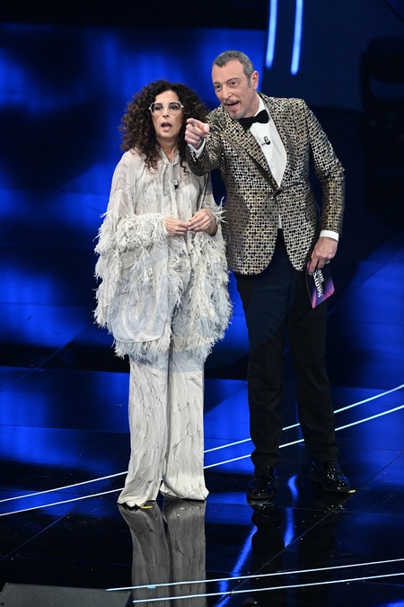 Teresa Mannino, Amadeus during Sanremo Italian Song Festival. Sanremo, Italy, 08 February 2024., Credit:Maria Laura Antonelli / Avalon