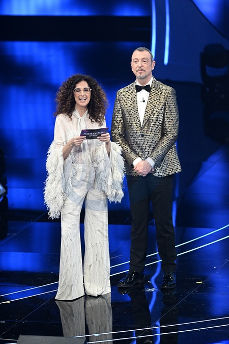 Teresa Mannino, Amadeus during Sanremo Italian Song Festival. Sanremo, Italy, 08 February 2024., Credit:Maria Laura Antonelli / Avalon