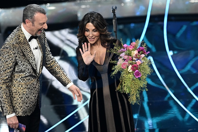 Amadeus, Sabrina Ferilli during Sanremo Italian Song Festival. Sanremo, Italy, 08 February 2024., Credit:Maria Laura Antonelli / Avalon