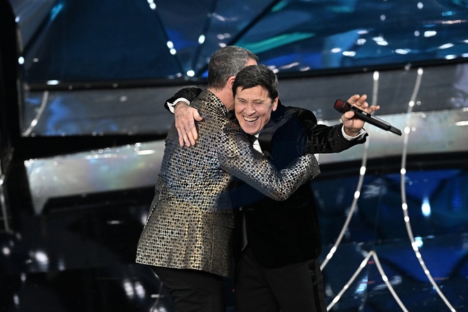 Gianni Morandi, Amadeus during Sanremo Italian Song Festival. Sanremo, Italy, 08 February 2024., Credit:Maria Laura Antonelli / Avalon