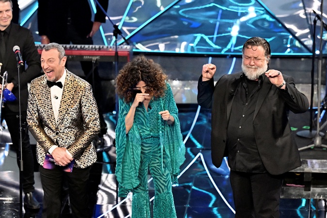 Amadeus, Teresa Mannino, Russel Crowe during the day 3 of 74th Sanremo Music Festival 2024, Italy - 08 Feb 2024, Credit:Maria Laura Antonelli / Avalon