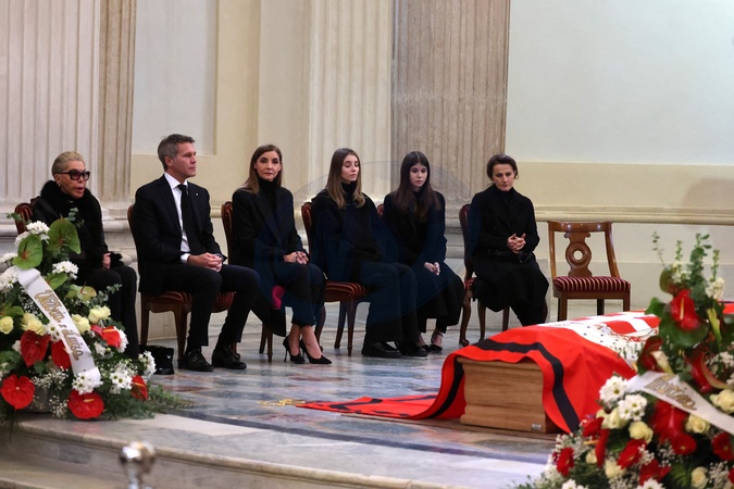 Veillée funèbre du prince Victor-Emmanuel de Savoie, en l'Eglise de Sant'Uberto à Turin, en présence de sa veuve Marina Ricolfi-Doria, de son fils, le prince E-P. de Savoie avec sa femme la princesse Clotilde Courau et leurs filles les princesses Vittoria et Louisa, le 9 février 2024. Le fils du dernier roi d'Italie s'est éteint le 3 février 2024 à l'âge de 86 ans. © Dominique Jacovides/Bestimage Funeral wake of Prince Victor-Emmanuel of Savoy, in the Church of Sant'Uberto in Turin, in the presence of his widow Marina Ricolfi-Doria, his son, Prince E-P. of Savoy with his wife Princess Clotilde Courau and their daughters Princesses Vittoria and Louisa, February 9, 2024. The son of the last king of Italy died on February 3, 2024 at the age of 86.