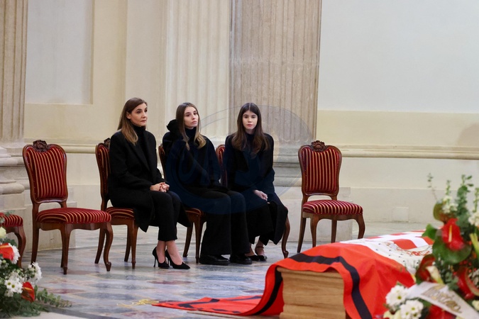 La princesse Clotilde Courau et ses filles les princesses Vittoria et Louisa - Veillée funèbre du prince Victor-Emmanuel de Savoie, en l'Eglise de Sant'Uberto à Turin, en présence de sa veuve Marina Ricolfi-Doria, de son fils, le prince E-P. de Savoie avec sa femme la princesse Clotilde Courau et leurs filles les princesses Vittoria et Louisa, le 9 février 2024. Le fils du dernier roi d'Italie s'est éteint le 3 février 2024 à l'âge de 86 ans. © Dominique Jacovides/Bestimage Funeral wake of Prince Victor-Emmanuel of Savoy, in the Church of Sant'Uberto in Turin, in the presence of his widow Marina Ricolfi-Doria, his son, Prince E-P. of Savoy with his wife Princess Clotilde Courau and their daughters Princesses Vittoria and Louisa, February 9, 2024. The son of the last king of Italy died on February 3, 2024 at the age of 86.