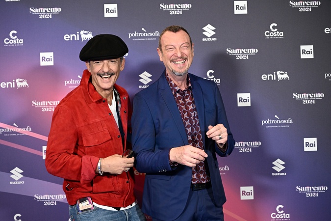 Amadeus and Rosario Fiorello during a photocall on the occasion of the 74th Sanremo Italian Song Festival, in Sanremo, Italy, 10 February 2024.