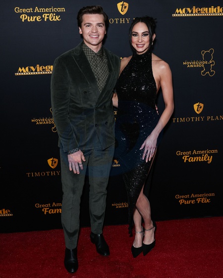HOLLYWOOD, LOS ANGELES, CALIFORNIA, USA - FEBRUARY 09: Joel Courtney and wife Mia Scholink Courtney arrive at the 31st Annual Movieguide Awards Gala held at AVALON Hollywood and Bardot on February 9, 2024 in Hollywood, Los Angeles, California, United States., Credit:Xavier Collin / Avalon