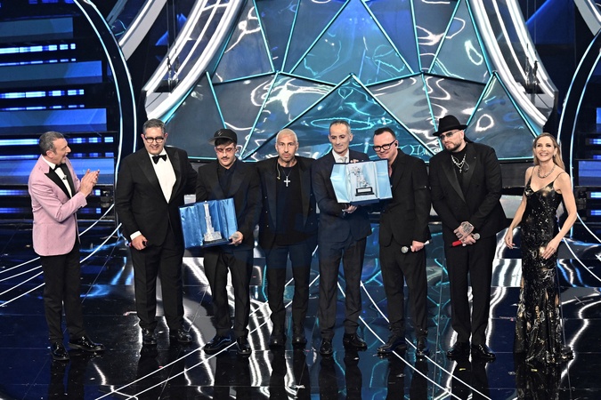 Amadeus, Giovanni Toti, Geolier, Gue, Luchè, Gigi D'Alessio, Lorella Cuccarini during the day 4 of 74th Sanremo Music Festival 2024, Italy - 09 Feb 2024, Credit:Maria Laura Antonelli / Avalon