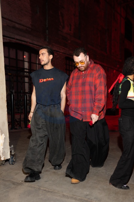 Sam Smith i jego towarzysz Christian Cowan opuszczają pokaz Willy'ego Chavarrii podczas New York Fashion Week