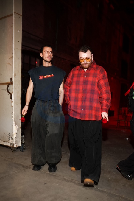 Sam Smith et son compagnon Christian Cowan aà la sortie du défilé Willy Chavarria lors de la Fashion Week de New York