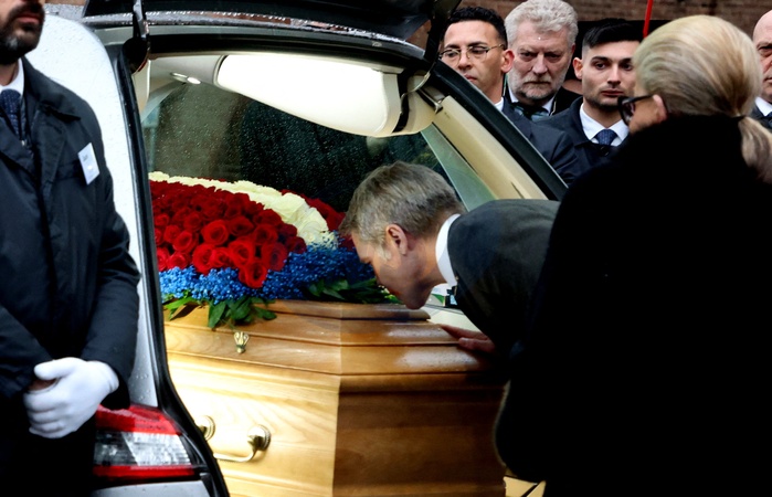 Le prince Emmanuel-Philibert de Savoie et sa mère Marina Ricolfi-Doria - Sorties des funérailles du prince Victor Emmanuel de Savoie en la basilique de Superga près de Turin le 10 février 2024. © Dominique Jacovides/Bestimage Exits from the funeral of Prince Victor Emmanuel of Savoy at the Basilica of Superga near Turin on February 10, 2024.