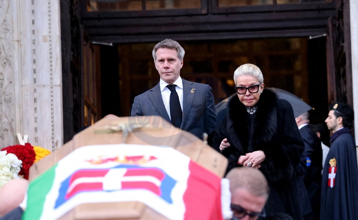 Le prince Emmanuel-Philibert de Savoie et sa mère Marina Ricolfi-Doria - Sorties des funérailles du prince Victor Emmanuel de Savoie en la basilique de Superga près de Turin le 10 février 2024. © Dominique Jacovides/Bestimage Exits from the funeral of Prince Victor Emmanuel of Savoy at the Basilica of Superga near Turin on February 10, 2024.