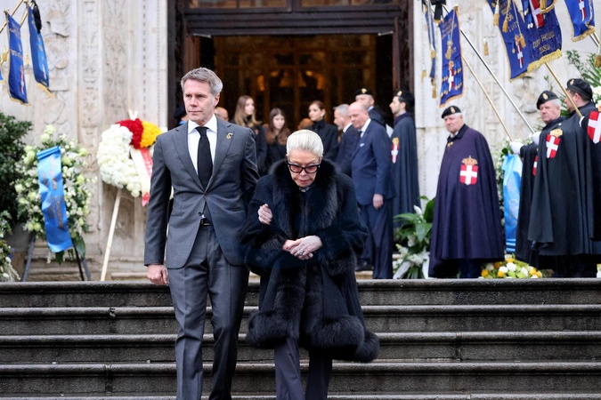 Le prince Emmanuel-Philibert de Savoie et sa mère Marina Ricolfi-Doria - Sorties des funérailles du prince Victor Emmanuel de Savoie en la basilique de Superga près de Turin le 10 février 2024. © Dominique Jacovides/Bestimage Exits from the funeral of Prince Victor Emmanuel of Savoy at the Basilica of Superga near Turin on February 10, 2024.