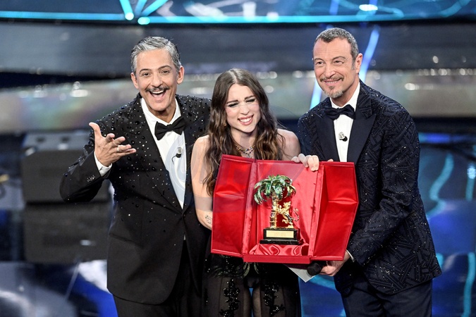 Amadeus, Fiorello, and Angelina Mango, winner of the Sanremo festival during the day 5 of 74th Sanremo Music Festival 2024, Italy - 10 Feb 2024, Credit:Maria Laura Antonelli / Avalon