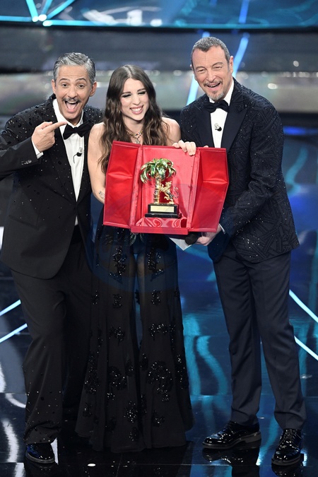 Amadeus, Fiorello, and Angelina Mango, winner of the Sanremo festival during the day 5 of 74th Sanremo Music Festival 2024, Italy - 10 Feb 2024, Credit:Maria Laura Antonelli / Avalon