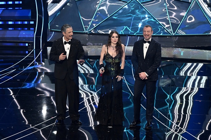 Angelina Mango, Amadeus, Fiorello during the day 5 of 74th Sanremo Music Festival 2024, Italy - 10 Feb 2024, Credit:Maria Laura Antonelli / Avalon