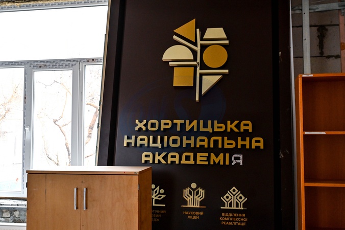 ZAPORIZHZHIA, UKRAINE - FEBRUARY 9, 2024 - The plate with the name of the Khortytsia National Academy is seen in Zaporizhzhia, southeastern Ukraine., Credit:Dmytro Smolienko / Avalon