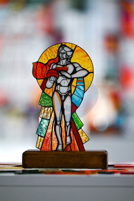 LVIV, UKRAINE - FEBRUARY 10, 2024 - A stained glass creation is showcased at the Careful Fragile! exhibition featuring the photo project of Mariupol journalist and researcher of the crimes committed by Russia against Ukrainians Ivan Stanislavskyi at the Mariupol Reborn office in Lviv, western Ukraine. The exhibition scheduled for March 2022 in Mariupol was cancelled due to Russia's full-scale war against Ukraine and the shelling of the city. The project is a collection of photographs of stained glass windows captured by Ivan Stanislavskyi across his native Mariupol in 2019-2021. These stained glass windows are likely lost as the buildings where these creations were located are destroyed as investigated by Ivan Stanislavskyi., Credit:Anastasiia Smolienko / Avalon