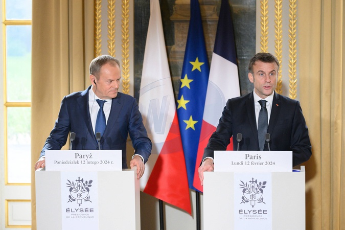 Le président de la République française Emmanuel Macron et le Premier ministre polonais Donald Tusk lors d'une conférence de presse commune au palais présidentiel de l'Elysée à Paris, France, le 12 février 2024. © Jacques Witt/Pool/Bestimage Donald Dusk and Emmanuel Macron. French President Emmanuel Macron and Polish Prime Minister Donald Tusk during a press conference at Elysee Palace, in Paris, France, on February 12, 2024.