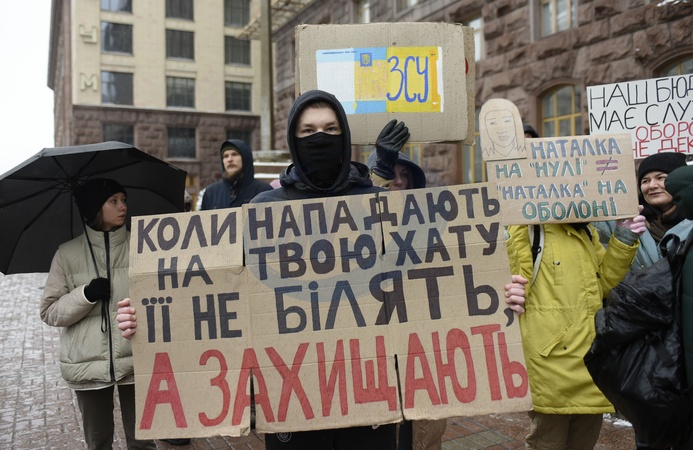 KYIV, UKRAINE - FEBRUARY 10, 2024 - Demonstrators demand that more funds should be allocated in Kyiv's budget for the military and procurement of armament during the Money for AFU (Armed Forces of Ukraine) rally at the Kyiv City State Administration building, Kyiv, capital of Ukraine., Credit:Ruslan Kaniuka / Avalon