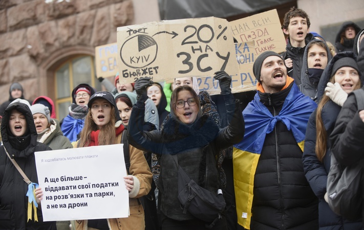KYIV, UKRAINE - FEBRUARY 10, 2024 - Demonstrators demand that more funds should be allocated in Kyiv's budget for the military and procurement of armament during the Money for AFU (Armed Forces of Ukraine) rally at the Kyiv City State Administration building, Kyiv, capital of Ukraine., Credit:Ruslan Kaniuka / Avalon