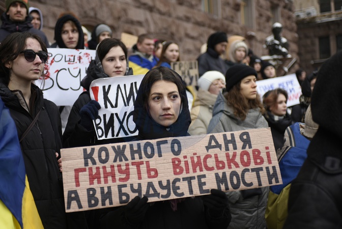 KYIV, UKRAINE - FEBRUARY 10, 2024 - Demonstrators demand that more funds should be allocated in Kyiv's budget for the military and procurement of armament during the Money for AFU (Armed Forces of Ukraine) rally at the Kyiv City State Administration building, Kyiv, capital of Ukraine., Credit:Ruslan Kaniuka / Avalon