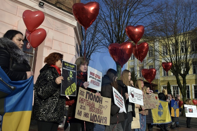 VINNYTSIA, UKRAINE - FEBRUARY 10, 2024 - Heart-shaped red balloons are pictured during a rally in Yevropeiska Square to remind about Mariupol Garrison POWs, Vinnytsia, west-central Ukraine., Credit:Oleksandr Lapin / Avalon