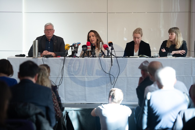 Stella Assange - wife of jailed Wikileaks founder Julian Assange, Wikileaks editor-in-chief Kristinn Hrafnsson (L) and Rebecca Vincent - Director of Campaigns for Reporters Without Borders (R) speaks at a Press conference about her husband's final appeal to happen next week - Royal Overseas League, London, England, UK on Thursday 15 February, 2024., Credit:Justin Ng / Avalon