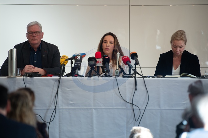 Stella Assange - wife of jailed Wikileaks founder Julian Assange, Wikileaks editor-in-chief Kristinn Hrafnsson (L) and Rebecca Vincent (R) speaks at a Press conference about her husband's final appeal to happen next week - Royal Overseas League, London, England, UK on Thursday 15 February, 2024., Credit:Justin Ng / Avalon