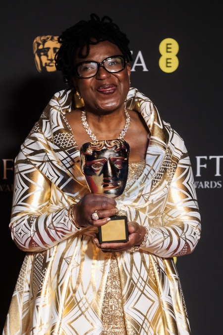 June Givanni poses backstage at the 2024 EE BAFTA Film Awards on Sunday 18 February 2024 at Royal Festival Hall, London. Pictured backstage with the BAFTA award for Outstanding British Contribution to Cinema., Credit:Julie Edwards / Avalon