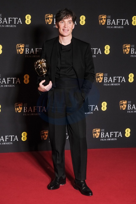 Cillian Murphy poses backstage at the 2024 EE BAFTA Film Awards on Sunday 18 February 2024 at Royal Festival Hall, London. Pictured backstage with the BAFTA award for Leading Actor., Credit:Julie Edwards / Avalon