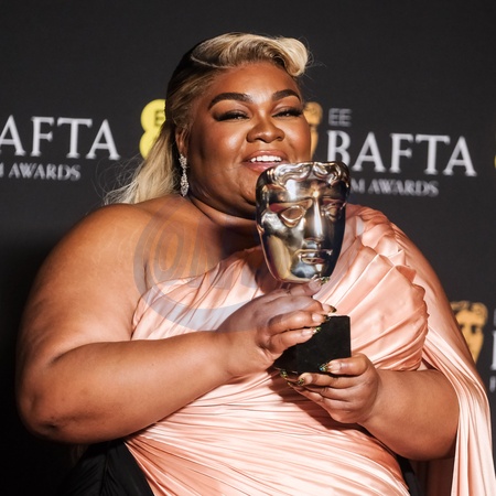 Da'vine Joy Randolph poses backstage at the 2024 EE BAFTA Film Awards on Sunday 18 February 2024 at Royal Festival Hall, London. Pictured backstage with the BAFTA award for Supporting Actress., Credit:Julie Edwards / Avalon