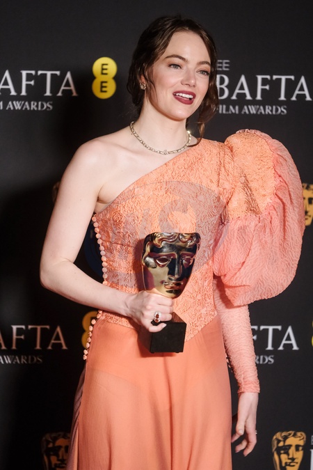Emma Stone poses backstage at the 2024 EE BAFTA Film Awards on Sunday 18 February 2024 at Royal Festival Hall, London. Pictured backstage with the BAFTA award for Leading Actress., Credit:Julie Edwards / Avalon