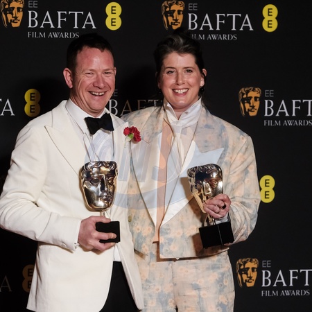 James Price and Shona Heath poses backstage at the 2024 EE BAFTA Film Awards on Sunday 18 February 2024 at Royal Festival Hall, London. Pictured backstage with the BAFTA award for Production Design., Credit:Julie Edwards / Avalon
