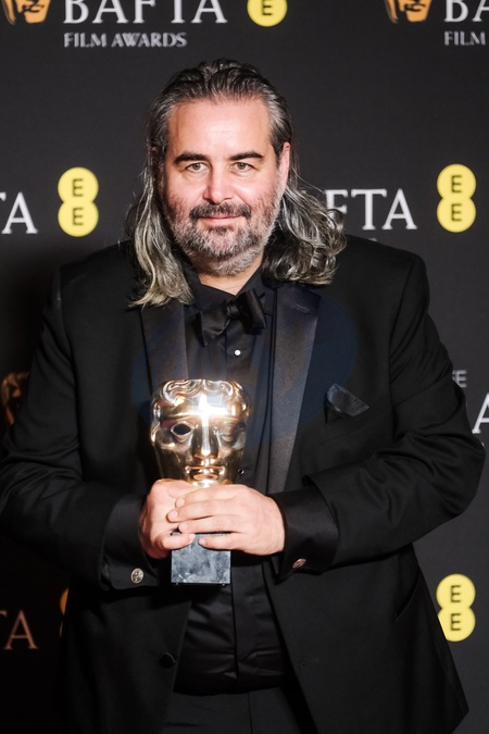 Hoyte Van Hoytema poses backstage at the 2024 EE BAFTA Film Awards on Sunday 18 February 2024 at Royal Festival Hall, London. Pictured backstage with the BAFTA award for Cinematography., Credit:Julie Edwards / Avalon