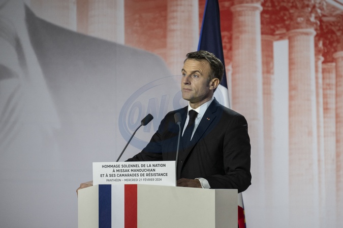 Le président Emmanuel Macron lors de la cérémonie d'État pour l'intronisation de Missak Manouchian et de sa femme Mélinee au Panthéon à Paris le 21 février 2024. © Eliot Blondet / Pool / Bestimage French President Emmanuel Macron gives a speech during the national tribute to the Armenian communist resistance fighter and his comrades at the Pantheon, in Paris on February 21, 2024.