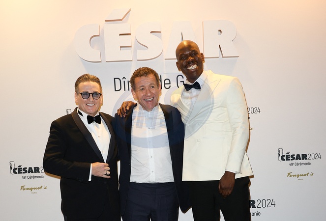 Benoit Magimel, Dany Boon et Jean-Pascal Zadi - Photocall de la 49ème édition de la cérémonie des César au Fouquet's à Paris Le 23 fevrier 2024 © Coadic Guirec / Bestimage