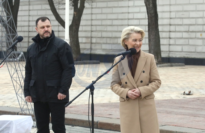 KYIV, UKRAINE - FEBRUARY 24, 2024 - Minister of Internal Affairs of Ukraine Ihor Klymenko and President of the European Commission Ursula von der Leyen are pictured during the ceremony to convey combat cars to the front line in Sofiiska Square, Kyiv, capital of Ukraine., Credit:Volodymyr Tarasov / Avalon
