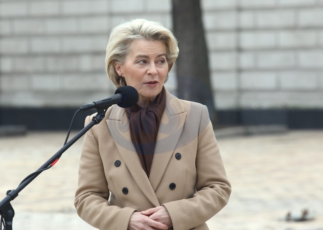 KYIV, UKRAINE - FEBRUARY 24, 2024 - President of the European Commission Ursula von der Leyen delivers a speech at a briefing during the ceremony to convey combat cars to the front line in Sofiiska Square, Kyiv, capital of Ukraine., Credit:Volodymyr Tarasov / Avalon