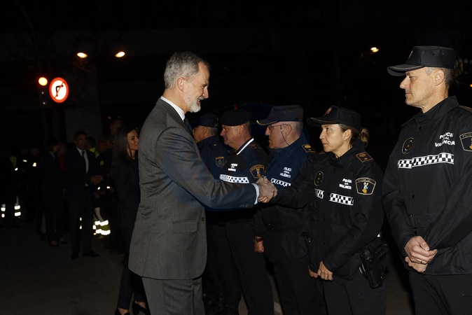 Le roi Felipe VI et la reine Letizia visitent la zone d'un complexe d'appartements de 14 étages après l'incendie qui l'a ravagé jeudi dernier à Valence