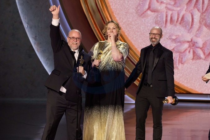 Mark Coulier, Nadia Stacey and Josh Weston accept the Oscar® for Makeup and Hairstyling during the live ABC telecast of the 96th Oscars® at the Dolby® Theatre at Ovation Hollywood on Sunday, March 10, 2024., Credit:Avalon.red / Avalon
