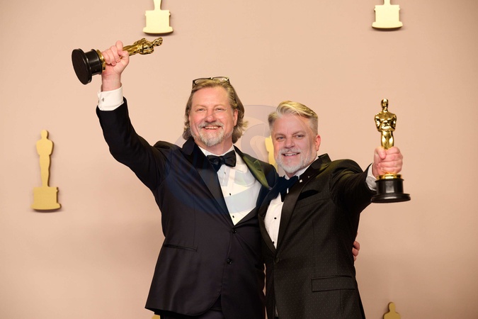 Dave Mullins and Brad Booker pose backstage with the Oscar® for Animated Short Film during the live ABC telecast of the 96th Oscars® at Dolby® Theatre at Ovation Hollywood on Sunday, March 10, 2024., Credit:SRS / Avalon