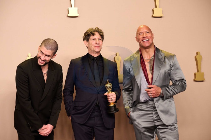 Presenters Dwayne Johnson and Bad Bunny pose with Jonathan Glazer and his Oscar® for International Feature Film during the live ABC telecast of the 96th Oscars® at Dolby® Theatre at Ovation Hollywood on Sunday, March 10, 2024., Credit:Michael Baker / Avalon