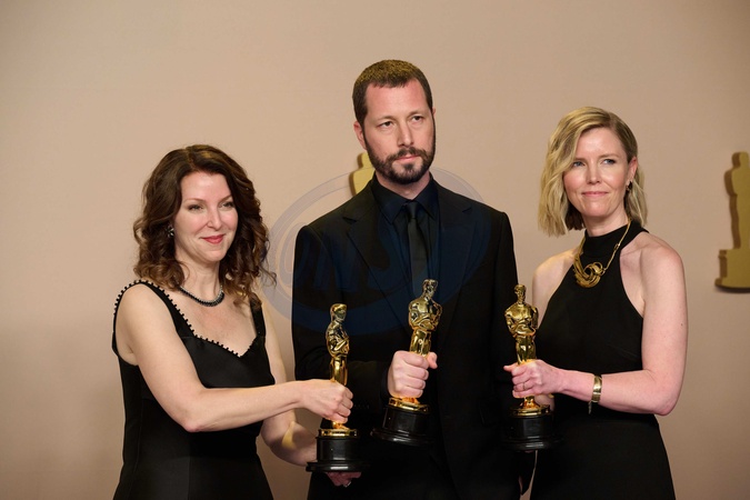 Raney Aronson-Rath, Mstyslav Chernov and Michelle Mizner pose backstage with the Oscar® for Documentary Feature Film during the live ABC telecast of the 96th Oscars® at Dolby® Theatre at Ovation Hollywood on Sunday, March 10, 2024., Credit:SRS / Avalon