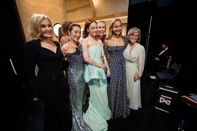 Emma Stone backstage with the Oscar® for Actress in a Leading Role alongside Jessica Lang, Michelle Yeoh, Charlize Theron, Jennifer Lawrence and Sally Field during the live ABC telecast of the 96th Oscars® at Dolby® Theatre at Ovation Hollywood on Sunday, March 10, 2024., Credit:sb / Avalon