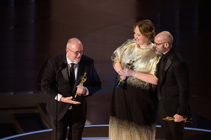 Mark Coulier, Nadia Stacey and Josh Weston accept the Oscar® for Makeup and Hairstyling during the live ABC telecast of the 96th Oscars® at the Dolby® Theatre at Ovation Hollywood on Sunday, March 10, 2024., Credit:Avalon.red / Avalon