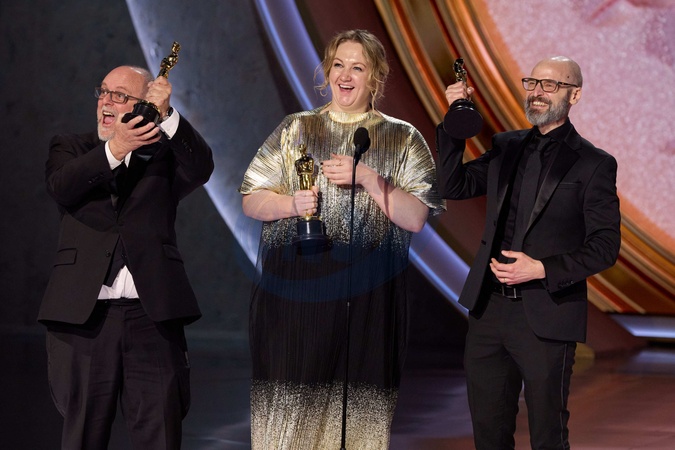 Mark Coulier, Nadia Stacey and Josh Weston accept the Oscar® for Makeup and Hairstyling during the live ABC telecast of the 96th Oscars® at the Dolby® Theatre at Ovation Hollywood on Sunday, March 10, 2024., Credit:Avalon.red / Avalon