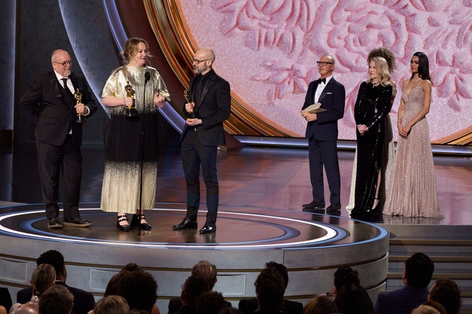 Mark Coulier, Nadia Stacey and Josh Weston accept the Oscar® for Makeup and Hairstyling during the live ABC telecast of the 96th Oscars® at the Dolby® Theatre at Ovation Hollywood on Sunday, March 10, 2024., Credit:Avalon.red / Avalon