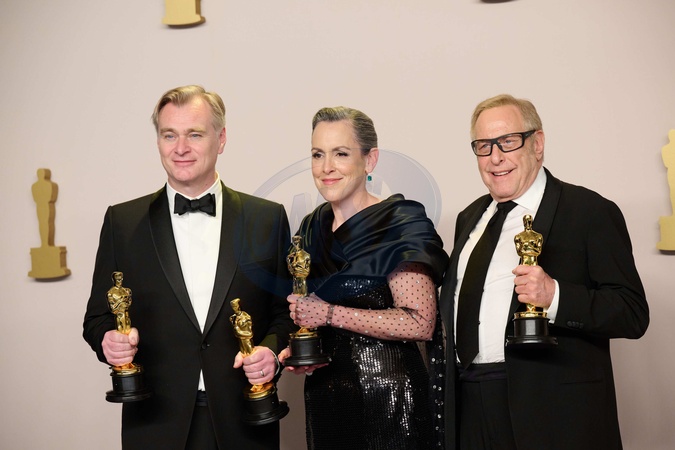 Christopher Nolan, Emma Thomas, and Charles Roven pose backstage with the Oscar® for Best Picture during the live ABC telecast of the 96th Oscars® at Dolby® Theatre at Ovation Hollywood on Sunday, March 10, 2024., Credit:Avalon.red / Avalon