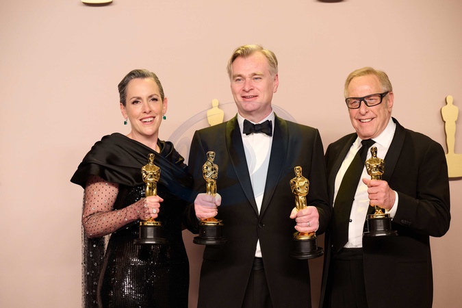 Emma Thomas, Christopher Nolan and Charles Roven pose backstage with the Oscar® for Best Picture during the live ABC telecast of the 96th Oscars® at Dolby® Theatre at Ovation Hollywood on Sunday, March 10, 2024., Credit:Avalon.red / Avalon